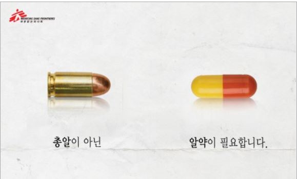 캠페인 포스터에는 “전쟁이 아닌 치료가 필요하다”는 의미로 비슷한 모양의 전혀 다른 의미를 가진 사물들을 대비적으로 나열해 표현했다. 세상에는 ‘총알’이 아닌 ‘알약’이 필요하며, ‘미사일’이 아닌 생명을 보호하는 ‘주사’, ‘죽이는 칼’이 아닌 ‘살리는 칼’이 필요하다는 메시지다.