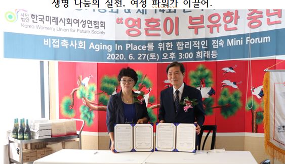 | 한국미래사회여성연합회는 제14회 한국미래여성포럼 ‘영혼이 부유한 중년’이라는 주제로 범국민 캠페인을 발표하며, “코로나 시대에 생각해 보는 삶과 죽음, 그리고 새로운 시작” 이란 주제로 조원현 원장이 특강을 했다. 죽음의 인식을 바꾸는 뜻깊은 강의를 끝난 후 협약이 진행됐다.