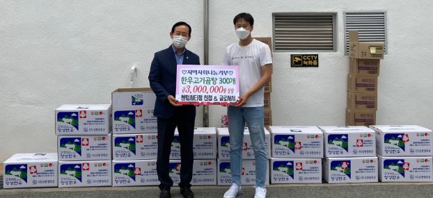 ㈜신세계 센텀시티점 신선&클로서리 이현구 실장, 고성군 아동시설 한우고기곰탕 전달정유근 기자 / |