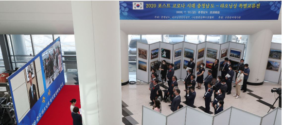 환담 이후에는 도청 본관 로비와 중국 랴오닝성에서 동시에 ‘2020 포스트 코로나 시대, 충청남도-랴오닝성 특별교류전’ 개막식을 개최했다.