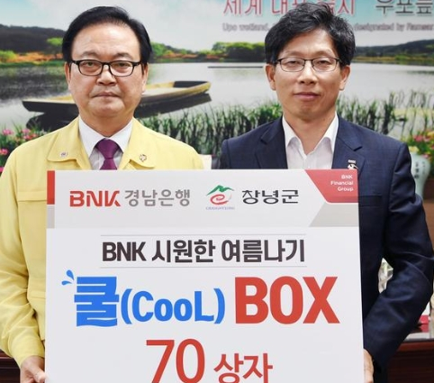 BNK경남은행 창녕지점, 시원한 여름나기 쿨(Cool)-Box 전달= BNK 창녕지점, 시원한 여름나기 위한 쿨(Cool)-Box 70세대에 전해 =정유근 기자 / |