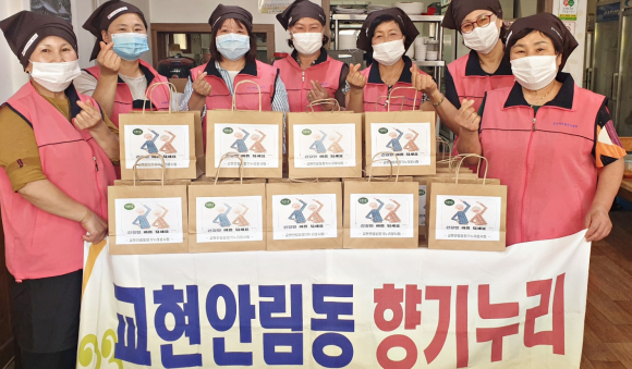 교현안림동향기누리, 충주시 자원봉사릴레이 운동 동참- 홀몸노인 및 저소득 노인 40가구에 삼계탕 전달 -김철상 기자 / |