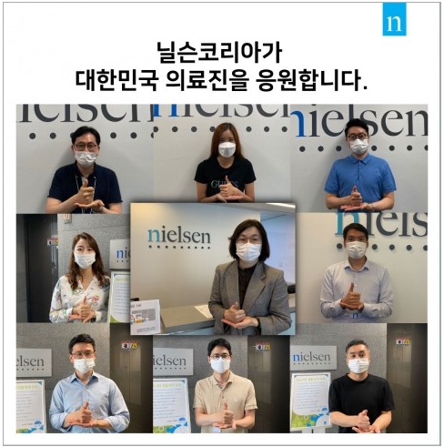 | ↑↑ - 위 사진: 31일 서울시 중구 닐슨코리아 사무실에서 최경희 대표를 비롯한 임직원들이 코로나19 의료진을 응원하는 마음을 담아 ‘덕분에 챌린지’에 참여하고 있다 |