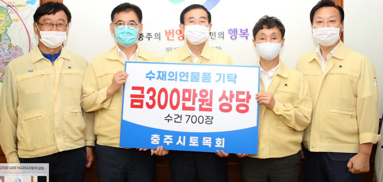 충주시 토목회, 수해의연물품 수건 700장 기탁- 현장에서 수해복구로 땀 흘리고 있는 자원봉사자와 피해 주민에 전달 -김철상 기자 / |
