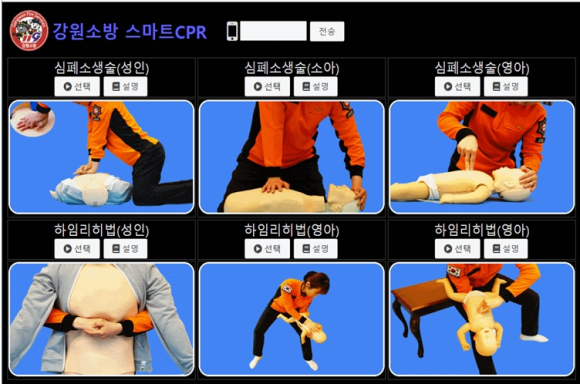 스마트 CPR 시스템은 구급대원 도착 전 심정지 환자 및 기도폐쇄 환자에게 정확한 응급처치법 안내를 위해 휴대전화로 이미지를 전송하여 직관적 전달력을 높이기 위한 프로그램이다.