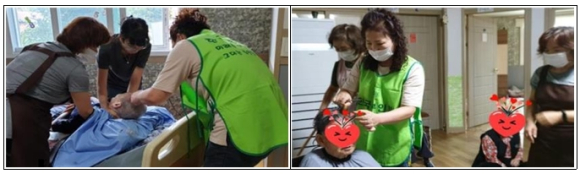 | □ (사)한국부인회평창군지회, 대화요양원 어르신 미용 봉사 ○ 지난(9.22.) (사)한국부인회평창군지회(회장 김복준)에서는 대화요양원을 방문하여 어르신들을 대상으로 미용 봉사를 실시하였음. ○ 그간 코로나19로 자주 방문하지 못한 아쉬움을 달래며 이번 봉사를 통해 많이 길어진 어르신들의 머리카락을 깨끗하게 이발해드리고 말벗이 되어드리는 뜻깊은 시간을 보냄.