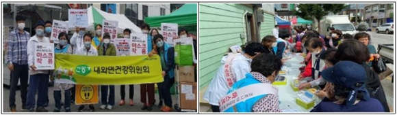 | □ 대화면 건강위원회, 추석명절 코로나19 예방을 위한 마스크 나눔 실시 ○ 어제(9.24.) 10:00, 대화면 건강위원회(위원장 오준세)에서는 대화전통시장 및 시가지 내에서 추석명절 코로나19 지역사회 감염예방을 위하여 마스크와 홍보물품 나눔 행사를 실시하였음. ○ 이번 나눔행사는 지역사회 감염예방을 위해 마스크 및 홍보물품을 배부하고 마스크 착용의 중요성을 널리 알리고자 마련하였음. ○ 대화면 건강위원회 회원들은 ’마스크 착용은 의무‘라고 적힌 현수막을 걸고 주민들에게 마스크와 홍보물품을 배부하였으며, 시가지 내 상가 및 공공·금융기관에 ’마스크 착용 필수‘라는 스티커를 부착하는 등 적극홍보에 나섰음. ○ 한편, 감염예방 홍보를 위해 평창군 보건의료원 감염병관리 부서에서도 현장을 찾아 마스크, 진드기 기피제, 팔토시 등을 나누었으며, 대화면사무소(면장 이용화)에서도 홍보물품(반찬통 세트)을 제공하고 현장에서 적극적인 홍보활동에 동참하였음.