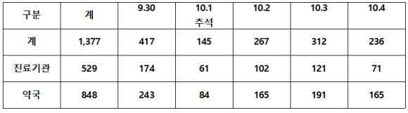 추석 연휴기간 응급진료체계 가동❶ 강원도 추석 연휴 응급진료 운영기간 : ‘20. 9. 30. ~ 10. 4.(5일간)❷ 연휴기간 중 문 여는 병·의원 529개소, 문 여는 약국 848개소 참여 * 도내 26개 응급실 운영기관은 연휴기간 동안 24시간 응급환자 진료 ❸ 119구급상황관리센터 및 중앙응급의료센터홈페이지 등에서 일자별 운영기관 확인가능 정민권 기자 / |