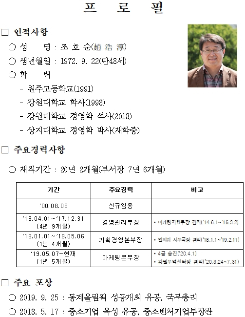 강원도경제진흥원(원장 이승섭)은, 10월 6일자로 조호순 마케팅본부장을 직위 승진시켜 경영사무처장(4급)으로 임용 한다고 밝혔다. ※ 마케팅본부장 겸직