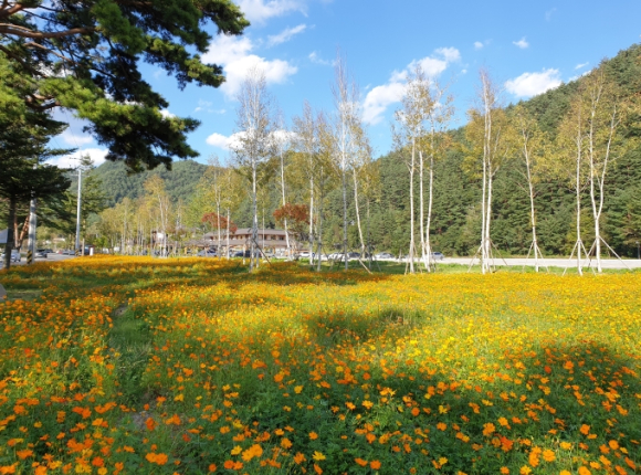 진부면 주민이 만든 꽃길 “오대산 가는 길 황화 코스모스 황금빛”으로 물들다정민권 기자 / |