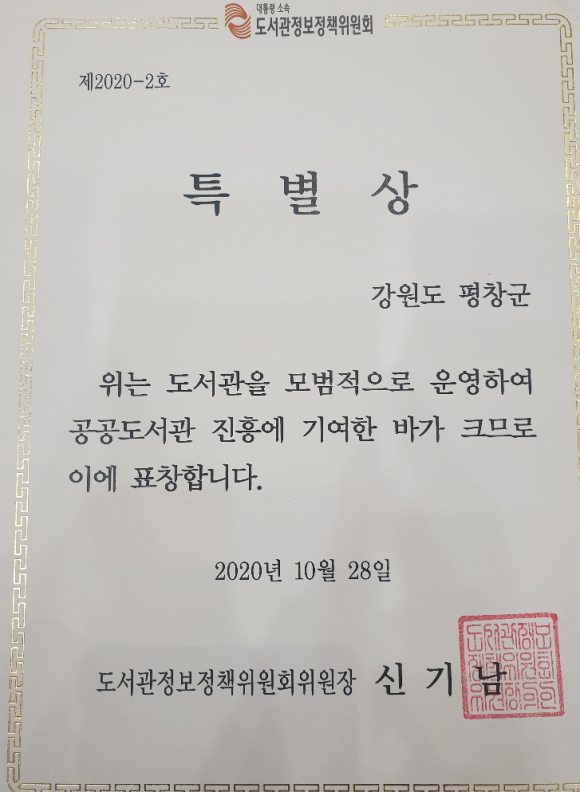 평창군, 전국도서관 운영평가 우수지자체 ‘특별상’수상- 제57회 전국도서관대회에서 '도서관정보정책위원회 위원장 특별상’수상정민권 기자 / |
