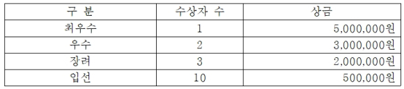 수상자에게는 최우수 5백만원, 우수 3백만원, 장려 2백만원이 각각 지급 되며, 강원도를 사랑하는 분이면 누구나 참여 가능하다.
