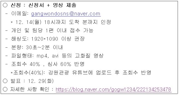 강원도(관광마케팅과)는 강원도 관광협회 주최․주관으로 11.3(화) ~ 12.14(월) 까지 찍고송 공모전을 추진한다고 밝혔다.