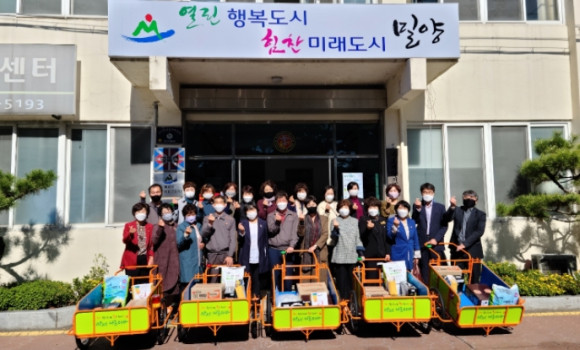 밀양시자원봉사센터, 한화디펜스 제작「안전 나르미카」전달- 폐지 수집 어르신들에게 특별 제작 리어카 5대 지원 -김철상 기자 / |