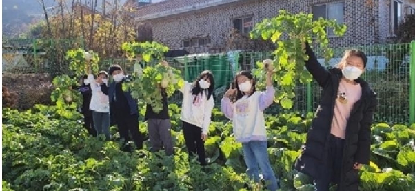 | 무와 배추가 자라는 모습, 잎의 모양 등을 관찰해 가는 활동을 마지막으로 한 해의 텃밭 체험 활동은 마무리가 된다. 2학기에 경기도에서 전학을 온 2학년 최○○ 학생은 ‘제가 제일 큰 무를 뽑았어요. 할머니께 맛있는거 해 달라고 할거예요.“ 라며 자기 머리보다 큰 무를 들고 뛰어 다닌다.