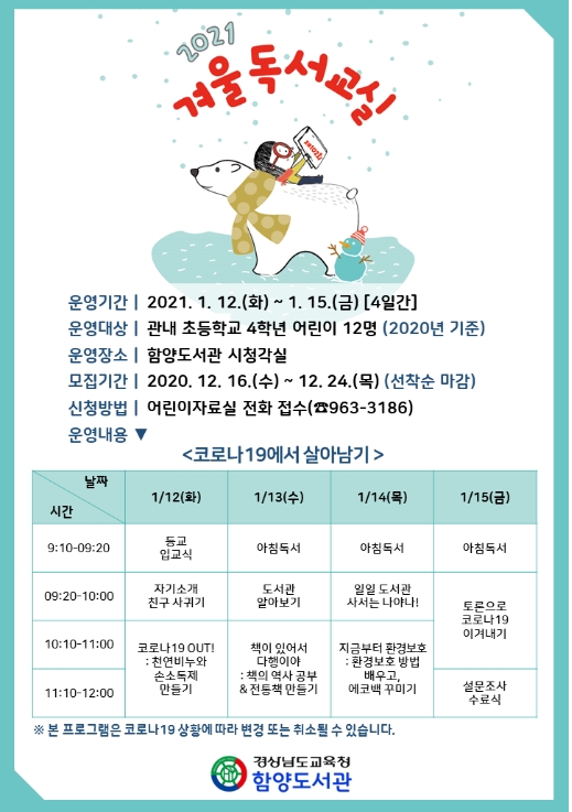 함양도서관, 겨울독서교실 참가자 모집- 주제‘코로나19에서 살아남기’, 초등 4학년 12명 선착순최정현 기자 / |