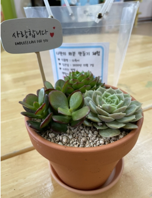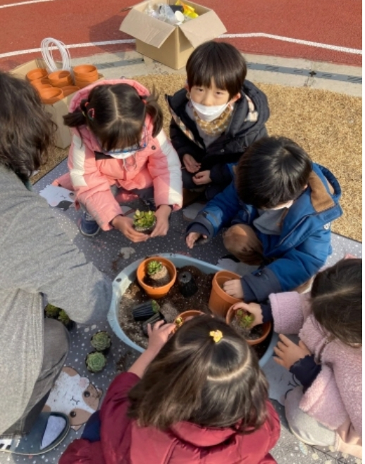 그런 다음 자신의 화분에 다육이(포이세티아)를 정성껏 옮겨 심어 이 세상에 하나뿐인 자신만의 화분을 만들었다. 식물을 키우는 방법에 대해 집중하는 유아들의 모습이 사뭇 진지하였으며, 오감을 통해 식물을 탐색할 수 있는 유익한 시간이 되었다.