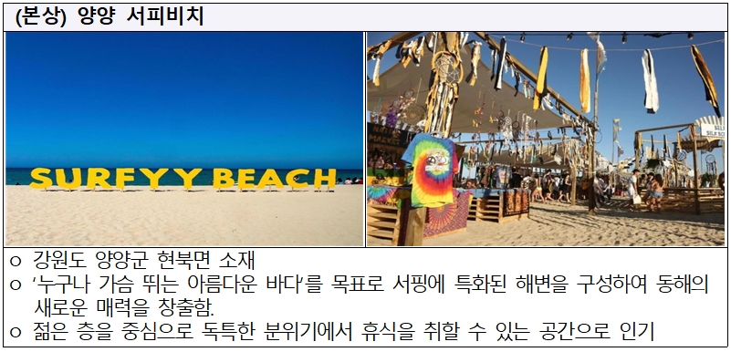 | 새로운 시도를 통해 코로나19 상황속에서도 매력을 창출한 관광자원으로 본상 수상한 양양군의 ‘서피비치’는, ‘바다를 즐기는 이국적인 프라이빗 비치’라 불리며, 여름 성수기는 물론 사계절 내내 서핑을 즐기는 사람들의 발길이 끊이지 않는 곳이며, 2030 세대를 중심으로 각종 SNS상에서 폭발적인 반응을 얻고 있는 양양의 랜드마크로 각광을 받고 있다.