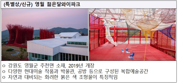 또한 코로나19의 장기화로 어려움을 겪고 있는 상황 속에서도 지역과 상생하며 방문객이 해변 공간에 최대한 분산되도록 공간 구성을 조성하여 확진자 발생 없이 꾸준히 여행객이 방문하는 등 성과를 거뒀다. 코로나19 상황 속에서도 미래를 향한 잠재력을 드러낸 신규 관광자원으로 특별상 수상한 영월군의 ‘젊은달와이파크’는, 관광객들이 자주 찾지 않았던 술샘박물관을 ‘재생’이라는 키워드로 생명을 불어넣어 재탄생시킨 복합문화예술공간이다.