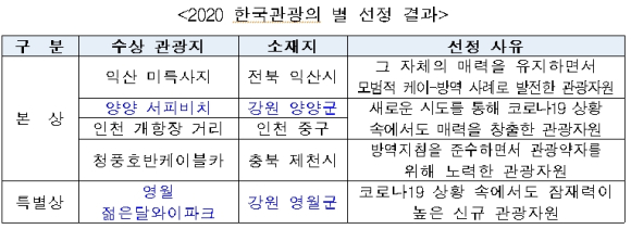 강원도는 문체부에서 주최하는 「2020 한국관광의 별」에서 전국 5개 관광자원 중 도내 2개 관광자원이 선정되는 영예를 안았다고 밝혔다.