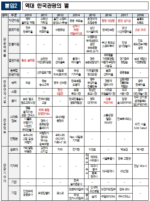 | 2010년에 시작해 10회째를 맞이한 「한국관광의 별」은 코로나19로 어려운 상황 속에서도 올 한 해 차별화된 매력과 철저한 방역관리로 한국 관광 발전에 기여한 관광지 다섯 곳을 ‘2020 한국관광의 별’로 선정했다.