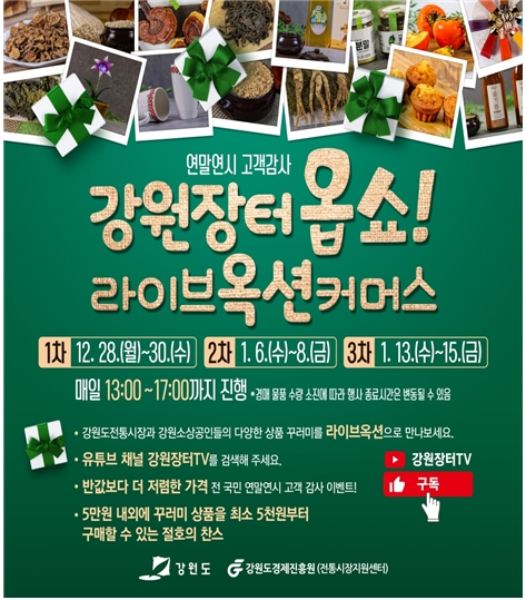강원도는 2020. 12.28.(월) ~ 2021. 1.15.(금) 3주 동안 총 9회에 걸쳐 오후 13시부터 강원장터TV 유튜브 채널을 통해 코로나19 장기화로 위축된 민생경제 위기 극복을 위한 비대면 경매 행사‘강원장터 옵쇼! 라이브 옥션 커머스’를 개최한다.