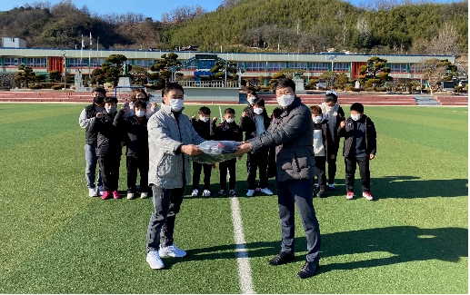 안의초등학교 축구부 발전을 위해 학부모님들로 구성된 안의초 FC 후원회(회장 김기종)에서 축구부 학생들을 위한 패딩 점퍼와 축구 장갑 등의 물품을 구입하여 기증한 것이다.