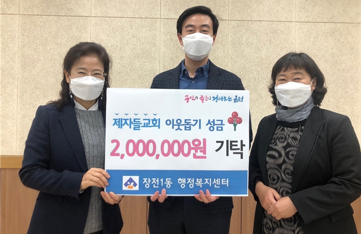 제자들교회, 장전1동에 이웃돕기성금 기탁김철상 기자 /