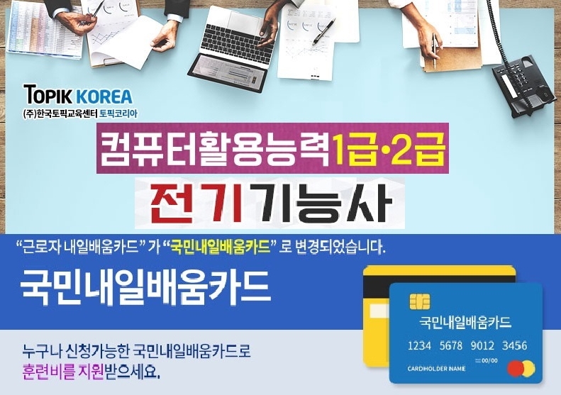 한국토픽교육센터 토픽코리아 국민내일배움카드에서는 전기기능사, 컴퓨터활용능력1급·2급 국가자격증 시험 준비를 위해 1월 9일에 근로자 국비지원교육으로 개강한다. 본 과정은 NCS기반 고용노동부 직업훈련으로 HRD-Net의 근로자 훈련과정에 등록되어 있는 과정이며 비대면 온라인교육으로 진행한다. 직장인은 고용보험에 가입된 자로서 고용노동부HRD-Net 또는 고용센터를 방문하여 재직자 내일배움카드를 발급받아 신청하면 된다.
