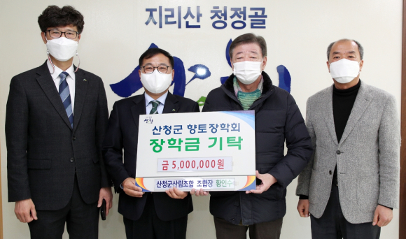 산청군산림조합(조합장 황인수)이 2일 산청군청을 찾아 향토장학금 500만 원을 기탁했다. 산청군산림조합은 지역 교육발전과 우수 인재 양성, 교육환경 개선을 위해 지난 2012년부터 매년 장학금을 기탁, 올해까지 모두 3500만원의 장학금을 기탁하고 있다. 특히 이번 기탁은 산청군산림조합이 2년 연속 전국 최우수조합 선정 포상금을 전달한 것으로 더욱 의미가 깊다.