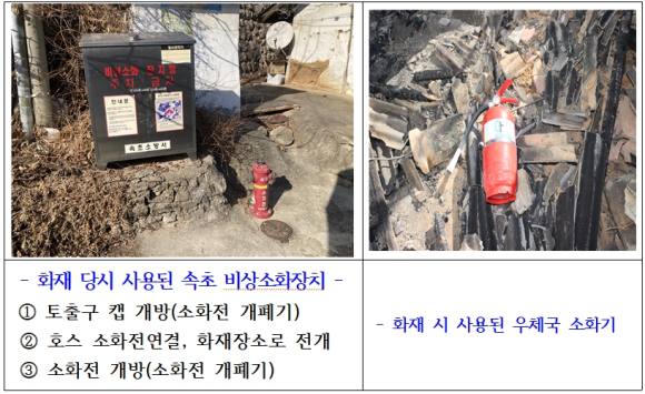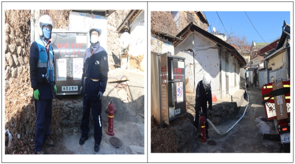 1명은 연결된 호스 3본을 화재장소로 전개하고, 1명은 소화전을 개방하여 화재를 진압했다. 비상소화장치함이 설치된 장소는 이들이 평소 우편업무를 수행하기 위해 주로 다니던 도로상에 설치되어 자연스럽게 화재 시 활용했다.