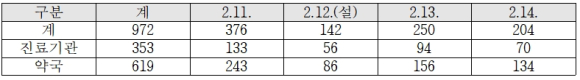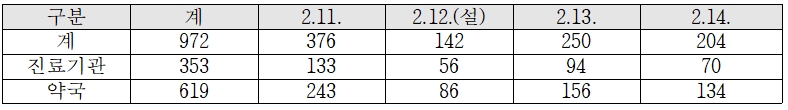 연휴기간 중 응급진료에는 보건기관 및 병의원 353개소, 약국 619개소 등 총 972개소가 참여하며, 도내 24개 응급의료기관 및 응급의료시설은 24시간 응급실을 운영한다. - 일자별 운영현황 (단위 : 개소)