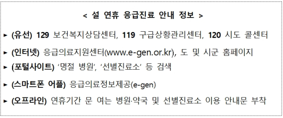 | 설 연휴기간 문 여는 병·의원 및 약국, 선별진료소 운영은 유선 및 기관별 홈페이지, 스마트폰 어플 등을 통해 안내받을 수 있다.