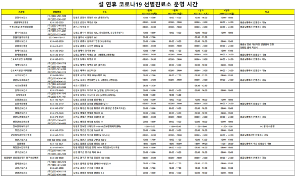 강원도는 설 연휴기간(‘21.2.11~2.14.)중 도민의 의료기관 및 약국 이용 불편을 최소화하고 응급환자 진료 및 다수 인명피해 발생에 대비하여 「설 연휴 응급진료체계」를 가동한다. 아울러, 코로나19 진단검사 공백 방지를 위해 설 연휴 선별진료소를 운영한다.