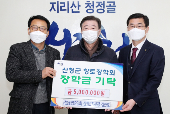 김한호 전 농협중앙회 산청군지부장 향토장학금 기탁올해 500만원…2014년부터 1900만원 전해김철상 기자 / |