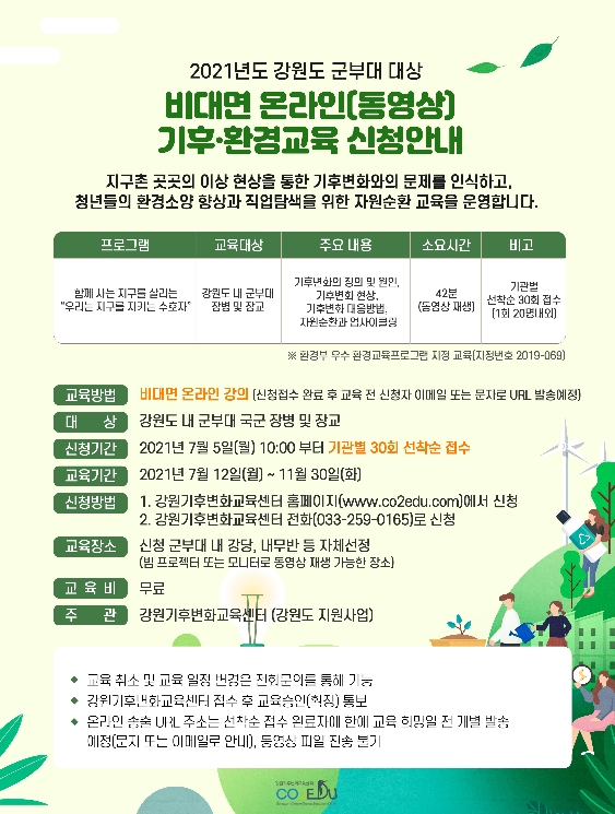 강원기후변화교육센터 강원도 내 군부대 대상 비대면 온라인(동영상) 기후‧환경교육 신청접수 실시정민권 기자 / |