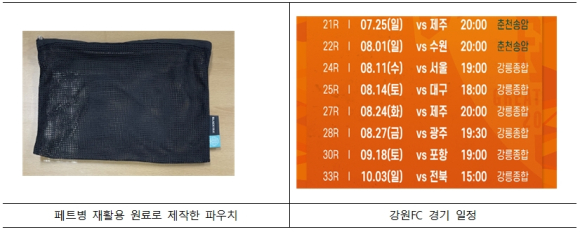 매 경기 시 축구 팬들이 투명 페트병을 모아오면 강원FC에서는 축구 팬들에게 페트병을 재활용해 만든 여행용 파우치를 증정하고, 춘천시와 강릉시는 모아진 페트병을 의류·신발 등의 고품질 원료로 재활용할 계획이다.