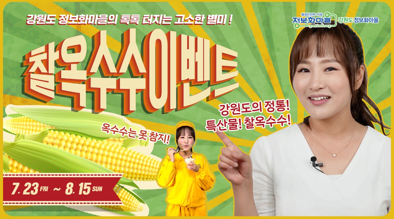 강원도는 도내 우수 농산물 홍보ㆍ판매 지원을 위한 2021년 제3회 소셜마케팅 카페트 지원사업으로도 정보화마을의「찰옥수수」홍보영상 지원을 추진한다고 밝혔다.