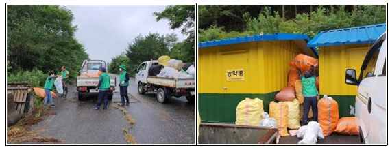 | □ 용평면 새마을협의회, 농약병 및 폐비닐 수거 봉사 활동 실시 ○ 어제(8.25.) 용평면 새마을협의회(회장 최기철, 부녀회장 정해옥) 회원들은 이목정1리 외 5개리 농가의 농약병과 폐비닐을 수거하는 봉사활동을 실시하였음.
