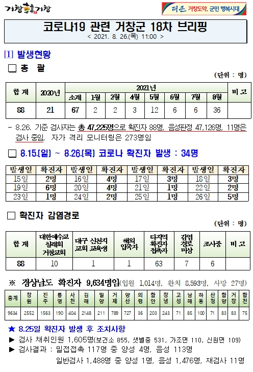거창군은 26일 11시 군청 상황실에서 코로나19 관련 거창군 18차 브리핑을 열고, 8월 15일 이후 34명의 확진자 발생에 대한 코로나19 상황과 군민 당부사항을 브리핑 했다.