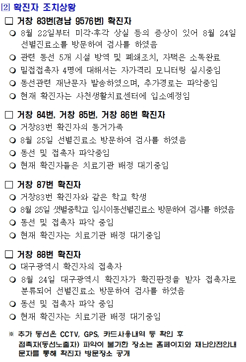 | 검사 결과 지난 25일 확진된 샛별중학교 학생 거창83번 확진자와 밀접접촉자로 분류되어 검사받은 4명(가족3, 학생1)과 타지역 확진자와 접촉하여 검사받은 1명 등 모두 5명이 26일 확진판정 됐다고 밝혔다.