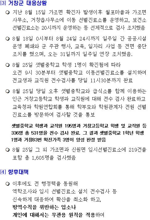 군은 지난 25일 샛별중학교에서 코로나19 확진자가 발생됨에 따라 당일 샛별중학교에 이동선별진료소를 설치하여 샛별중학교와 인근 거창고등학교 전교생 및 교직원에 대해 전수검사를 실시하고 학부모와 학원관계자에게도 검사할 것을 통보했으며, 가조면과 신원면에도 임시 이동선별진료소를 설치하여 총 1,605명을 검사했다.