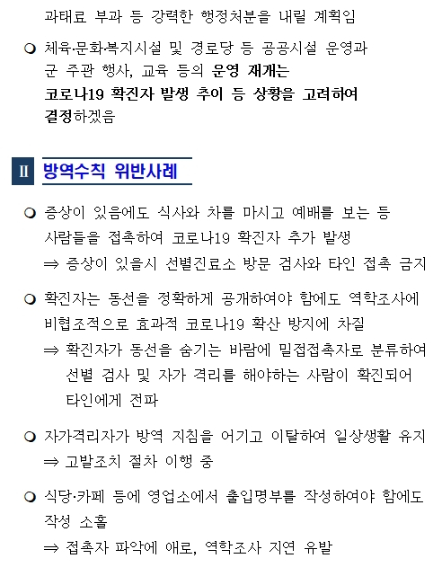 | 특히, 이날 브리핑에서 일부 확진자 발생 시설과 관련자가 자료제공 및 동선파악에 비협조적으로 역학 조사와 코로나19 방역에 어려움을 겪고 있으며, 자가격리자가 자가격리 수칙을 준수하지 않고 이탈한데 대해서는 고발조치 등의 절차를 이행하고 있다며 적극적인 협조를 당부했다.