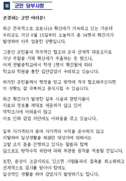 군은 이후에도 전 행정력을 동원해 확산방지에 총력을 기울이고 있으며, 역학조사와 임시 이동선별진료소를 설치하여 전수검사를 하는 등 확산을 최소화하고 방역수칙을 위반하는 업소나 개인에 대해서는 과태료 부과 등 무관용 원칙을 적용해 강력한 행정 처분을 내릴 계획이다.