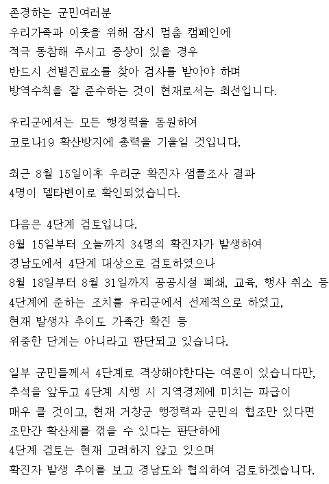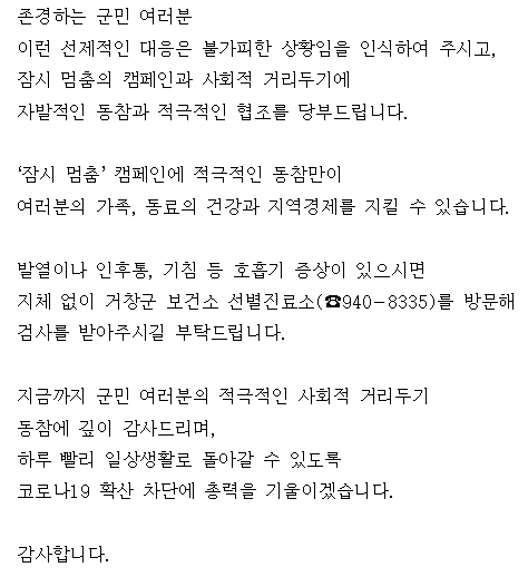 구인모 거창군수는 “군은 모든 행정력을 동원하여 최근 코로나19 확진자 발생 상황 종결에 총력을 기울이겠다”며 “군민 모두가 잠시 멈춤 캠페인에 적극적으로 동참하는 것이 최선이고 증상이 있을 경우 반드시 선별진료소를 찾아 검사를 받아야 하며 방역수칙을 잘 준수해 주시길 바란다”고 했다.