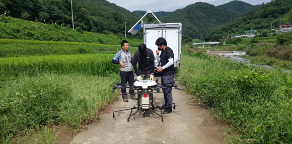 가북면, 콩 재배 지역 드론 활용 항공방제 시행‘21년 읍·면 연두순방 주민의견수렴을 통해 최초 시행한용택 기자 /