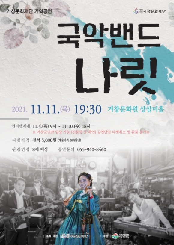 (재)거창문화재단은 국악밴드 ‘나릿’, ‘첼리스트 송영훈과 함께하는 클래식 속으로’, 동화무용극 ‘빨간모자’ 공연을 11월에 선보인다고 밝혔다.