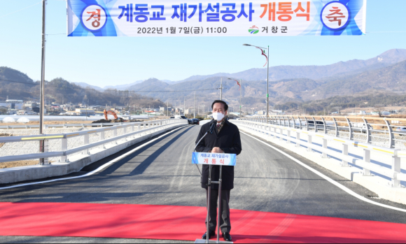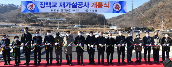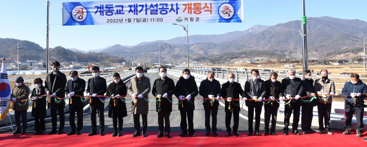 거창군은 지난 7일 마리면 장백마을과 계동마을 입구에서 구인모 군수와, 도·군 의원, 사업관계자, 마을주민 등이 참석한 가운데 진입교량 재가설 준공을 축하하는 교량 개통식을 개최했다고 밝혔다. 이날 개통식은 코로나 19 방역 수칙 준수와 의전행사 간소화로 사업 추진 경과보고와 감사패전달, 테이프 커팅식의 순으로 진행했다.