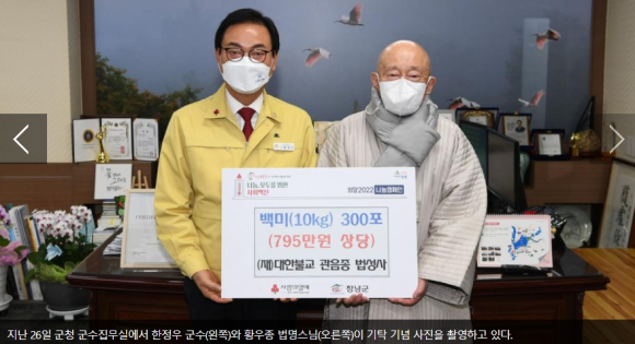 법성사 설 명절 따뜻한 나눔 실천= 저소득층 위해 백미(10kg) 300포 기탁 =정유근 기자 / |