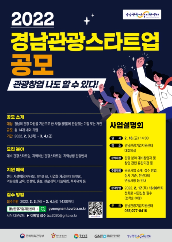 자세한 안내를 위해 2월 18일 14시 경남관광기업지원센터 대회의실에서 선착순 30명을 대상으로 사업설명회가 진행될 예정이며, 참가를 희망하는 자는 2월 17일 오후 4시까지 전화(055-277-8416)로 신청하면 된다.
